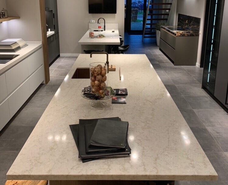 Denna sten är idealisk för dem som letar efter ett lugnt och elegant bänkskivsmaterial. Kvarts är motståndskraftigt mot repor och fläckar, vilket gör det till ett utmärkt val för köksbänkar, badrumsskåp och andra ytor där det krävs ett starkt och hållbart material.